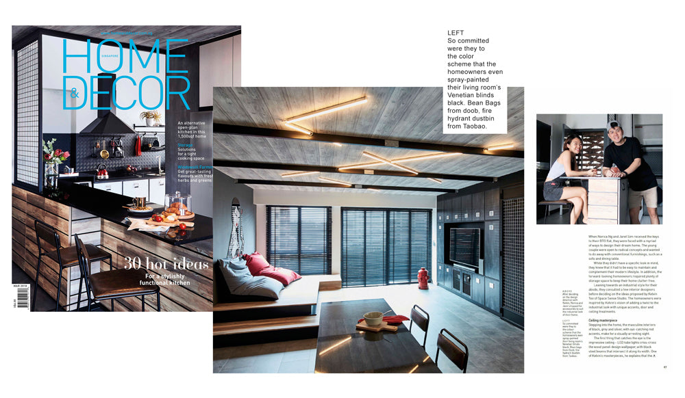 “Built above two steps, the platform’s wooden decking is seemingly supported by l-beams, which can be made out from its edges. “Initially we wanted a cosy area for us to watch TV without a couch,” says Jaret, “but I think Kelvin’s platform idea turned out nicely. When we lay on our bean bags to watch TV, it is very comfortable because the screen is at eye level.”