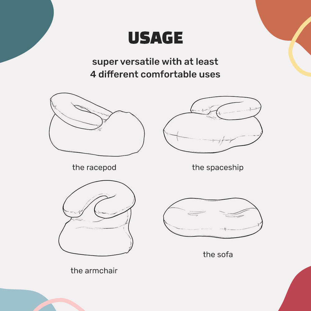 The main bean bag can be used in a variety of positions, and combined with its stretchy material, will accommodate any posture you prefer, without introducing stress or strain to your back or joints (unlike chairs, pffft). The fwooarmrest further can be used separately from the main bean bag, as a body pillow, an armrest, a headrest, and even a laptop rest. Mothers can even use the fwooarmrest as a maternity pillow.