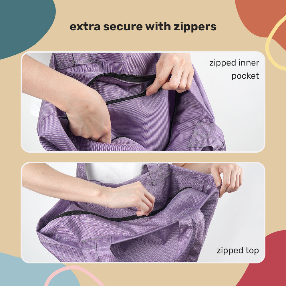 Choose your carrying style – small handles for a dash of chic, or big handles for ultimate practicality. Plus, inside, you’ll find a handy pocket for your essentials. The top can be zipped up for added security – no more worrying about your haul spilling out.